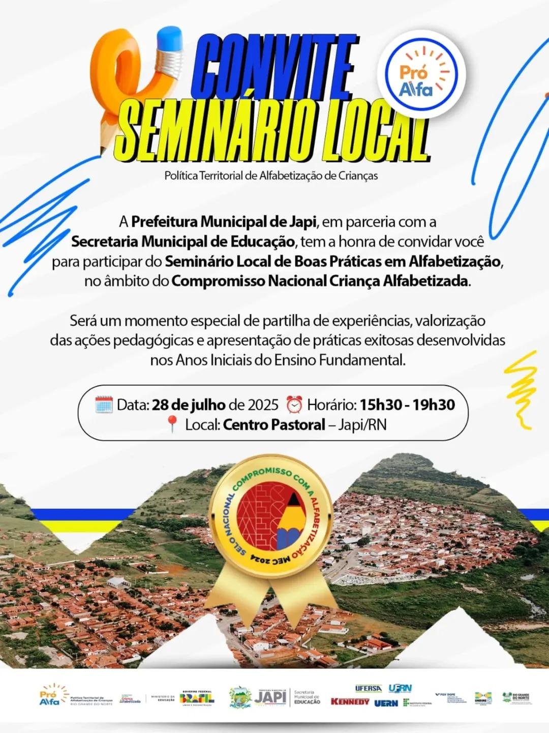 A Secretaria Municipal de Educação de Japi convida todos os educadores e parceiros da rede para o Seminário Local de Boas Práticas em Alfabetização, no âmbito do Compromisso Nacional Criança Alfabetizada – Pró-Alfa RN.