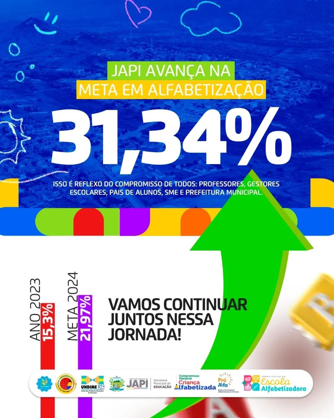 Em 2024, Japi alcançou 31,34% de alunos alfabetizados, um avanço expressivo em relação a 2023, quando o índice era de 15,3%.