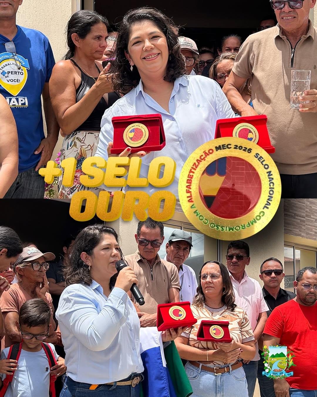 Na imagem, já em Japi, em frente à Prefeitura, a prefeita registra esse momento especial ao lado dos selos conquistados de forma consecutiva, reforçando o compromisso da gestão com a alfabetização na idade certa.