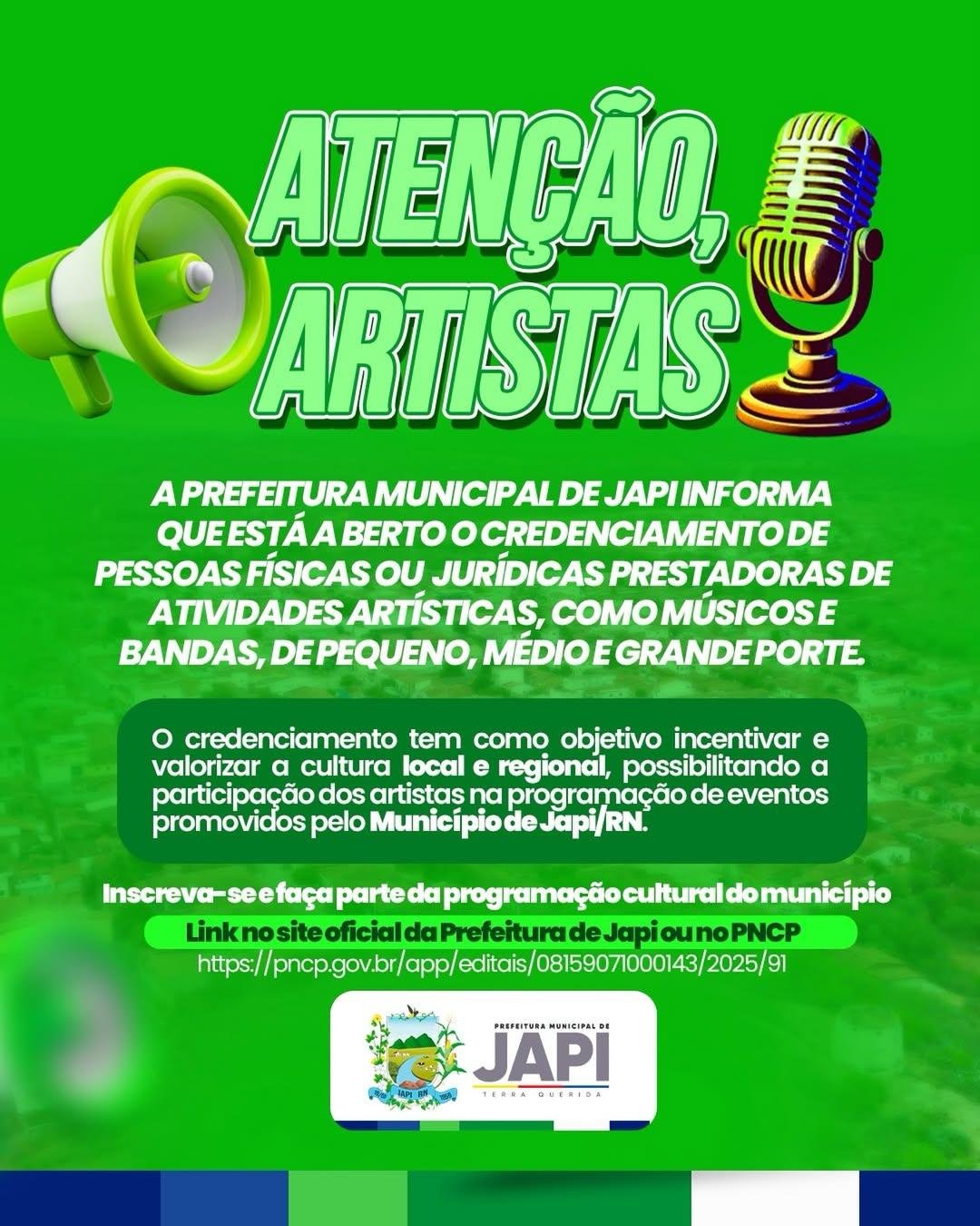 A Prefeitura Municipal de Japi informa que está aberto o credenciamento de artistas, músicos e bandas de pequeno, médio e grande porte.