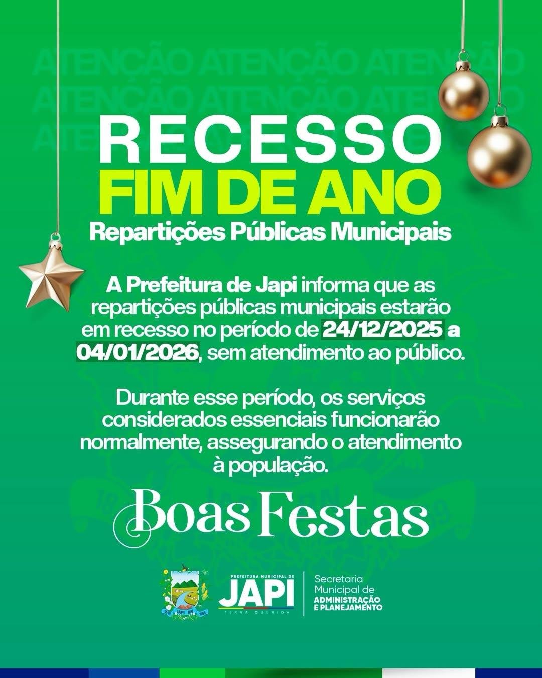 A Prefeitura de Japi informa que as repartições públicas municipais estarão em recesso no período de 24 de dezembro de 2025 a 04 de janeiro de 2026, sem atendimento ao público.