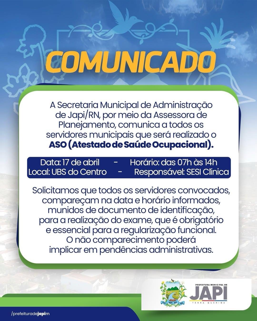A Prefeitura de Japi, por meio da Secretaria Municipal de Administração, informa que será realizado o ASO (Atestado de Saúde Ocupacional), etapa fundamental para a regularização funcional.
